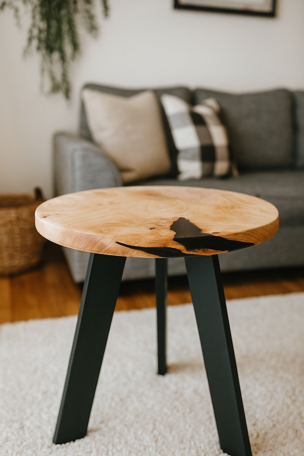 The combination of hard maple and dark smoky epoxy create a stunning piece of furniture. This side table will keep your attention for days. Finished with multiple coats of chemical free oil & waxes, it will be protected for years to come. Mounted on steel legs which have been finished in black powder coat.