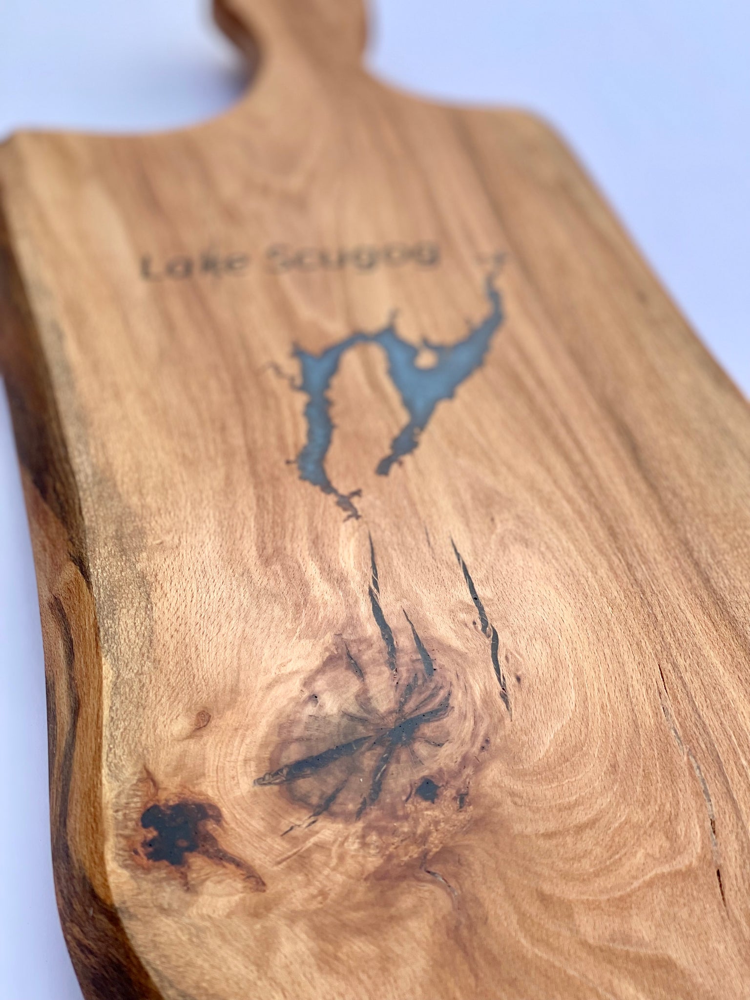- Precision-carved Lake Scugog map with blue epoxy inlay